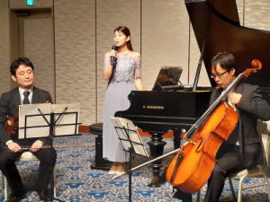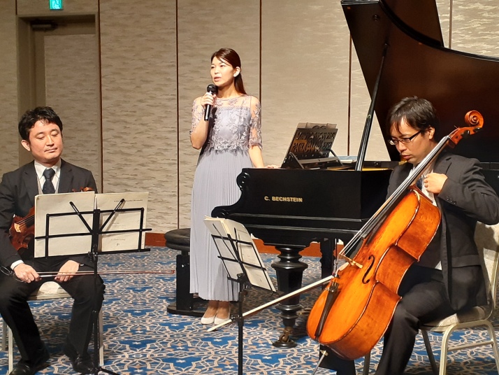 当会初めての音楽例会。新会員紹介の後、ピアノ、バイオリン、チェロによる三重奏は会場を包み込むハーモニー演奏に出席者全員、感動の拍手。ピアニスト石渡真知子さんが弾いたベヒシュタインピアノの解説をしてくれた。戦前、国立の東京商科大学(現一橋大学)兼松講堂にあったピアノで学徒出陣の最中、美貌の原智恵子がこのピアノを弾いて戦場に向かう学生を励ましたとのことでピアノソロではショパンの幻想即興曲、ノクターン、エオリアンハーブ曲を演奏いただき、アラカルト(三重奏)ではハンガリー舞曲第5番など感動の演奏をプレゼントしてくれた