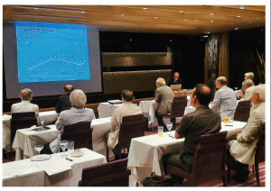 氏がセンター長を務める神戸大学先端膜工学研究センターは国際交流、産学連携、教育・研究を骨子とした、日本で唯一の総合的膜工学拠点である。昨今の世界的水不足や温暖化対策をFO膜・有機溶剤分離膜・CO2分離膜等の開発研究によって解決、実用化を目指していることを各種のデータとビジュアルによって膜分野に疎い我々に氏はわかりやすく解説してくれた。その具体的事例として化学プラントの蒸留法から膜処理に変えることによる低炭素への試み、逆浸透膜(RO)による海水淡水化の新しい試みなどを挙げ、又、今後の企業化についてはコストとの挑戦課題があることをコンパクトに纏めていただいた素晴しい講演で、未知の分野である「膜」の世界に我々を引き込んでいただいた。